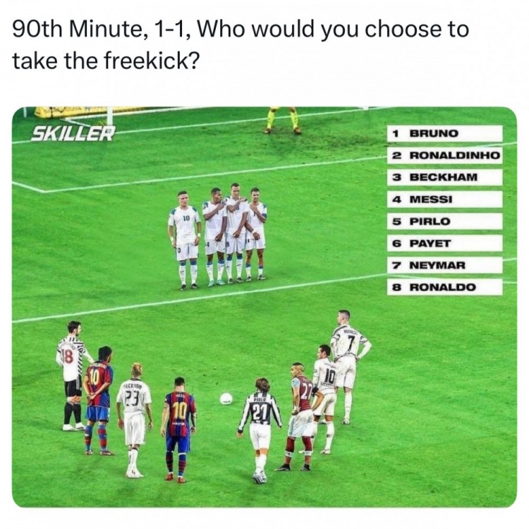 90 phút, tỷ số là 1-1, bạn sẽ chọn ai thực hiện quả đá phạt trực tiếp này?